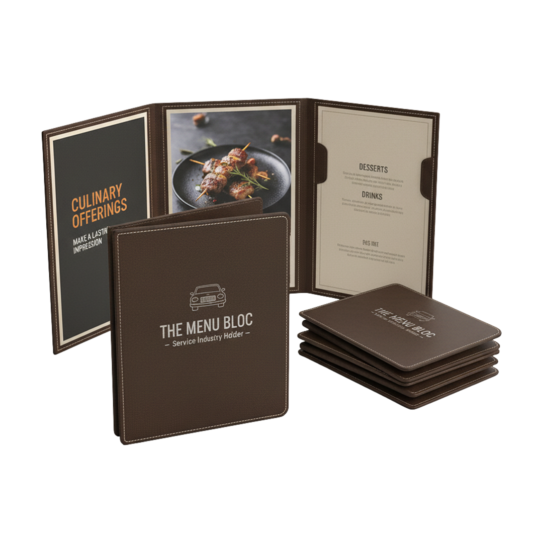 Designed specifically for the hospitality sector, the Menu Bloc by SAIF UL BURHAN INTL brings elegance and protection to your restaurant or café menus. Made from durable Rexine or leather-textured material, this menu holder ensures your menus stay pristine while exuding luxury.