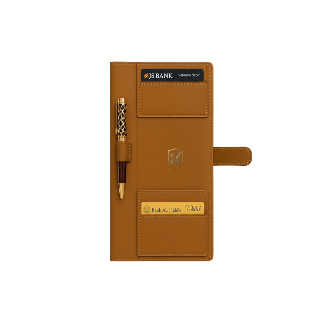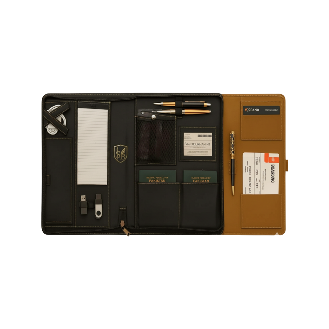 At SAIF UL BURHAN INTL, we create travel companions that go beyond function — they tell your brand’s story of preparedness and sophistication. The Voyage Kit is a premium artificial leather travel folder designed for professionals who value order, efficiency, and elegance on every journey.