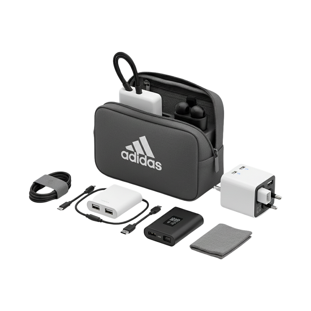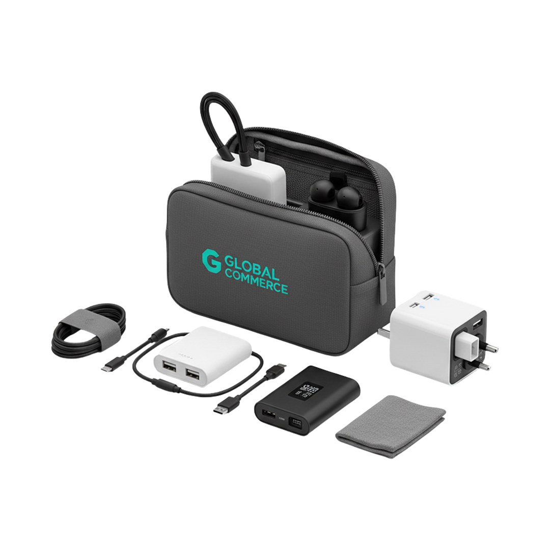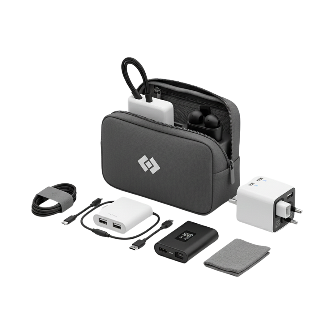 Each kit typically combines charging cables, power banks, travel adapters, and earphones, all securely housed in a custom-branded pouch or hard case. Compact and durable, it’s perfect for frequent travelers, sales executives, and event delegates.
