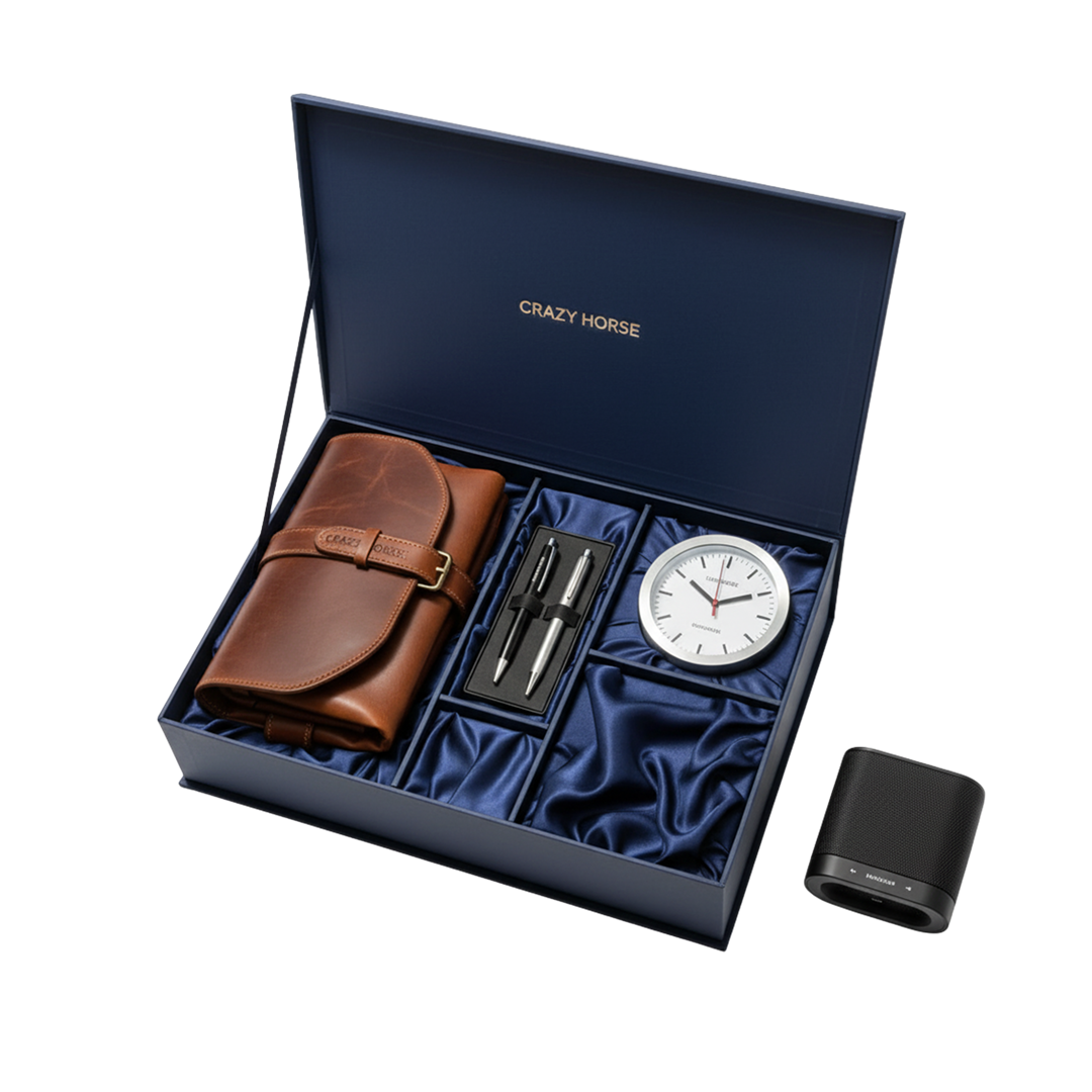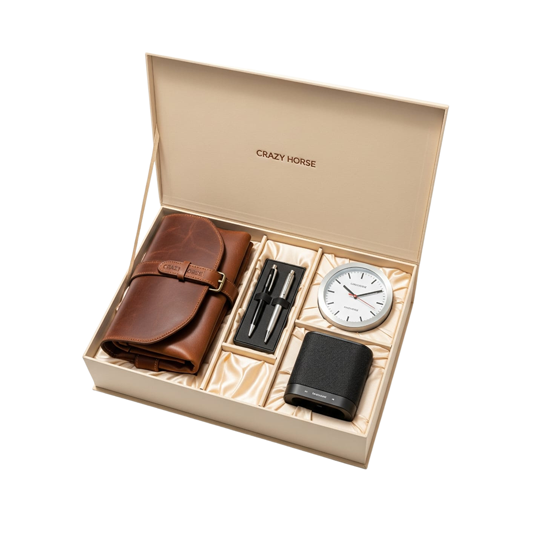 The set includes a Crazy Horse Leather Bag, a Branded Pen Set, a Luxury Watch, and a Wireless Speaker — each carefully curated to balance elegance with practicality. The Crazy Horse Leather Bag stands out with its vintage texture and long-lasting finish, while the Branded Pen Set adds a refined executive touch to every signature. The Premium Watch exudes timeless class, and the Wireless Speaker enhances the modern lifestyle of those who value both productivity and leisure.