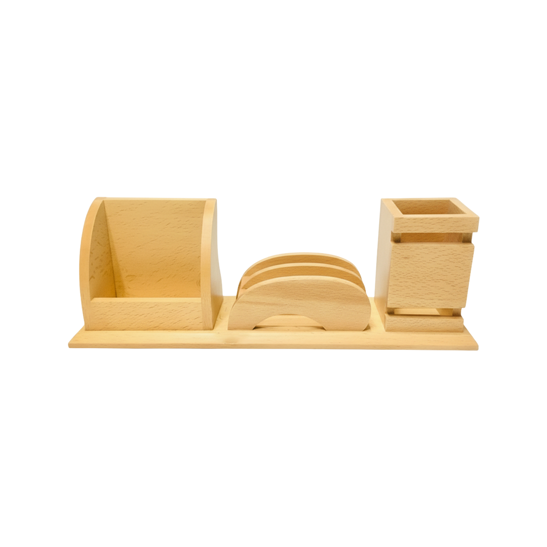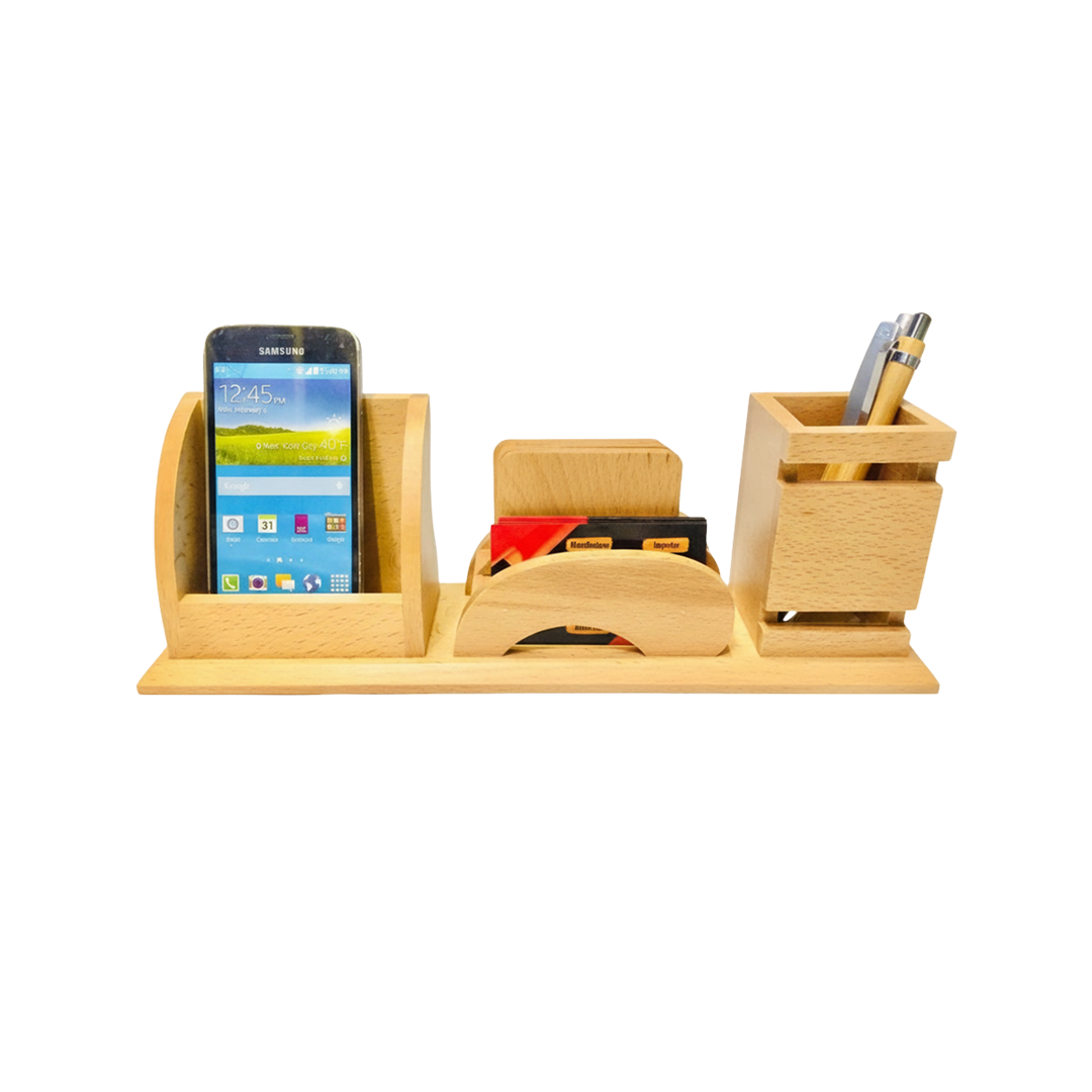 This multipurpose organizer includes a phone holder, pen holder, card holder, and tea coasters, all harmoniously integrated to keep your essentials organized while adding a touch of sophistication. Each section is thoughtfully positioned — the phone holder for stable viewing, the pen slot for quick access, the card holder for networking ease, and the coasters to protect surfaces with class.